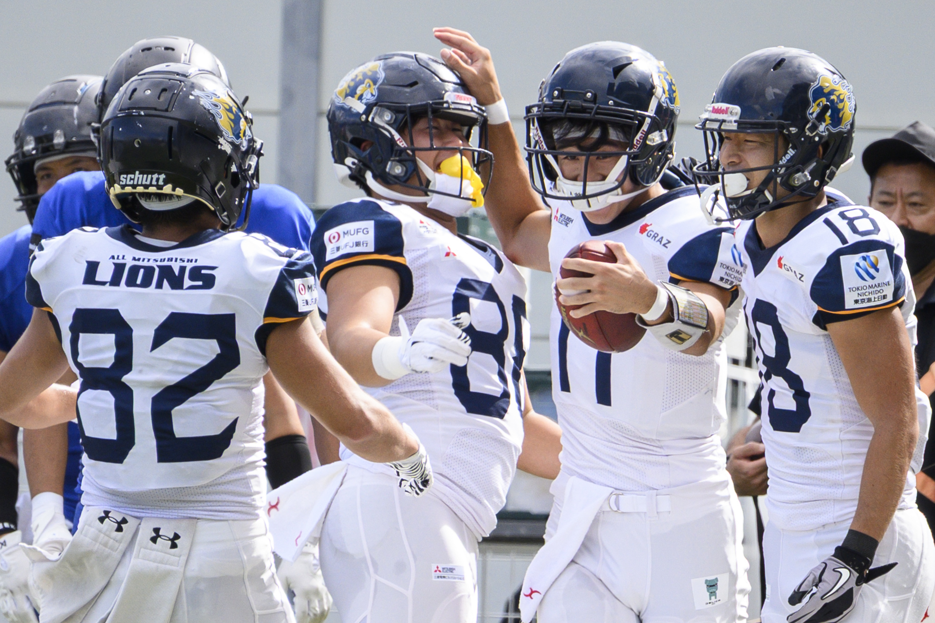 オフェンスでは#11 QB 山中勇輝選手から#81 WR 小原嶺選手へのパス、ルーキー#30 RB ISAIAH KHALIL MALCOME選手のランでファーストダウンを更新しました🦁