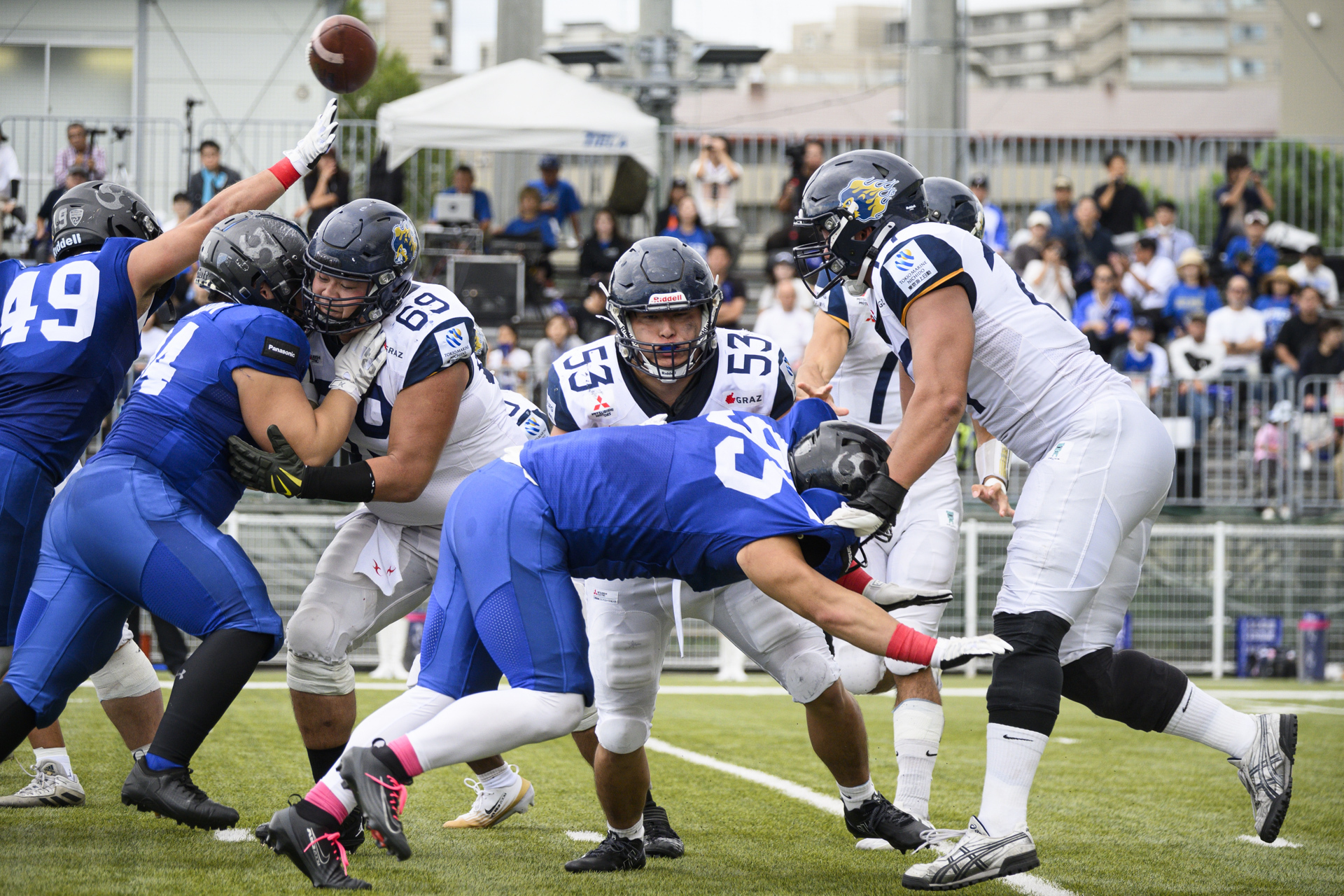さらに #40 LB 海崎琢選手、同志社大学キャプテンを務めた#32 DB 強力幹央選手もナイスディフェンスを見せます!
